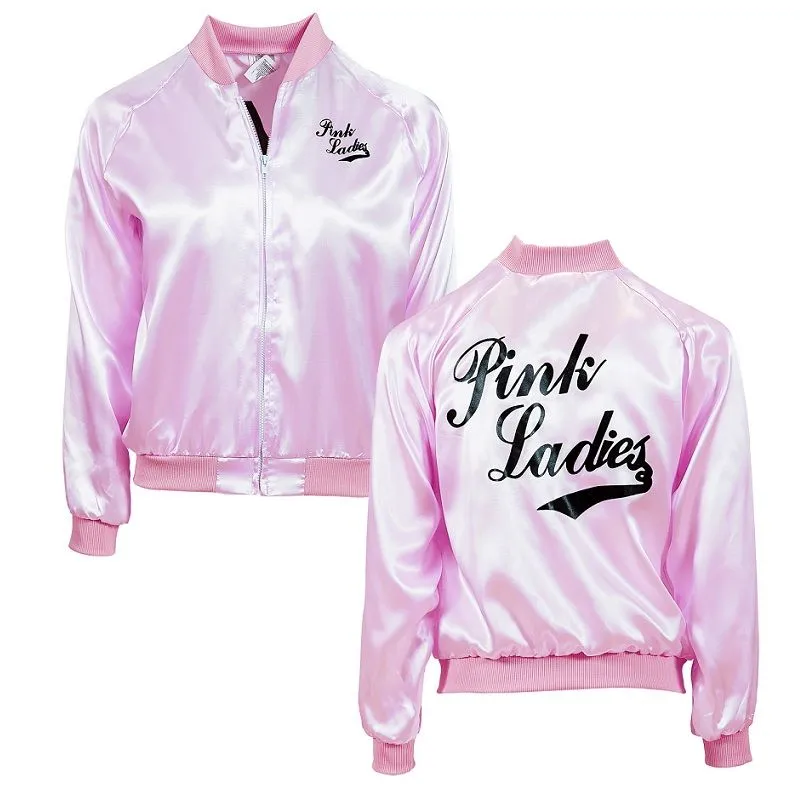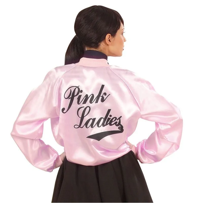 Blouson rose claire effet satinĂ© avec une fermeture blanche et avec Ă©crit en noir devant et derrière “Pink Ladies” pour montrer votre appartenance au club avec Sandy, Betty et toutes les autres.