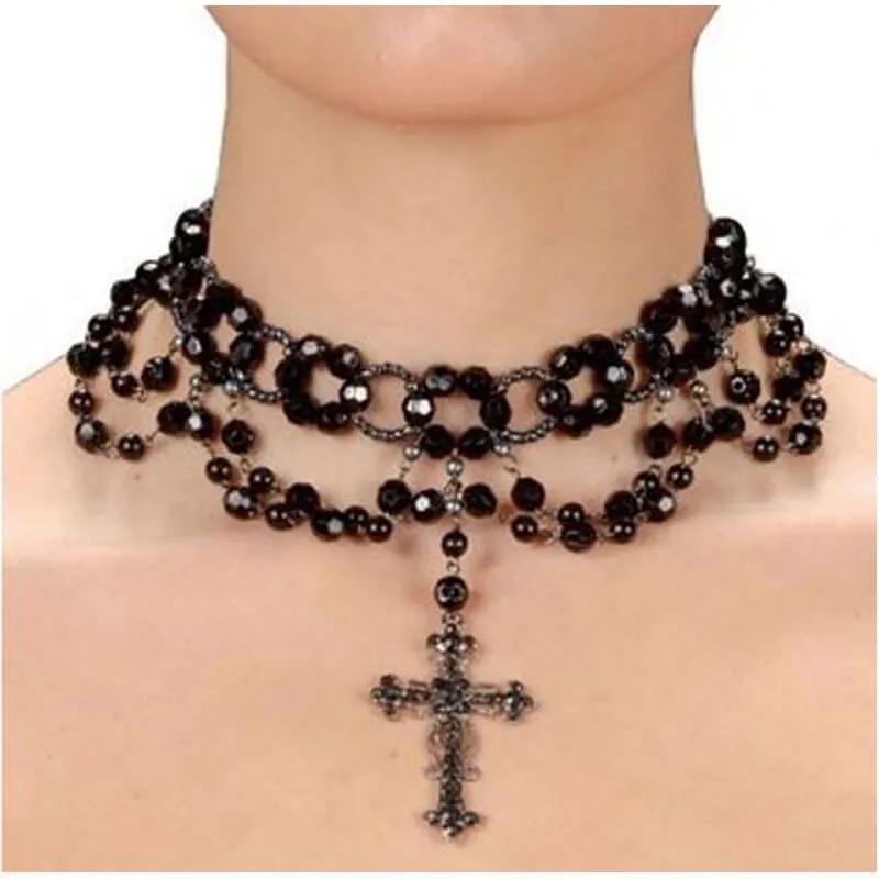 Agrémentez votre tenue de vampire femme avec ce collier ras du cou de perles noires avec une croix pendante. Cet accessoire élégant et chic sera du plus bel effet.