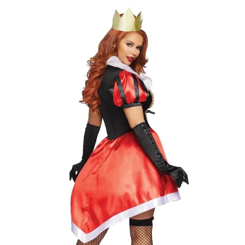 Ce déguisement est composé d’une robe rouge, blanche et noire avec des dorures et un grand col blanc en voile. Le haut de la robe donne un effet de corset avec un laçage noir et sur le bas de la robe vous trouverez des motifs de coeur et de pique.