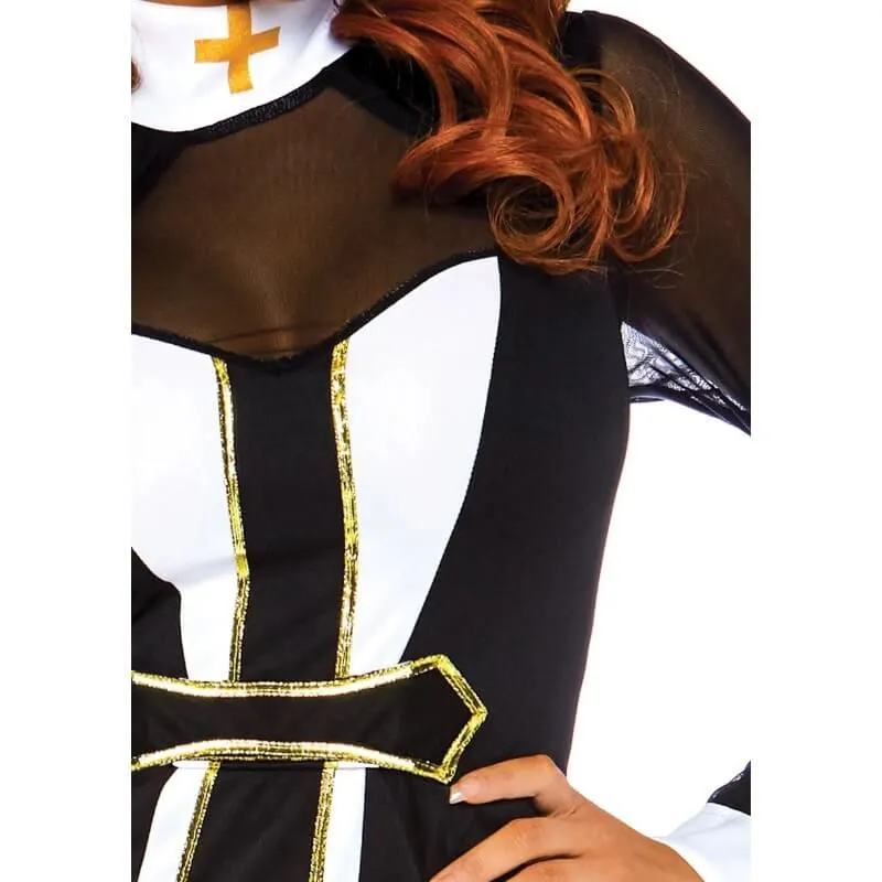 Pour votre soirée de Saint-Valentin ou Halloween ou tout simplement pour faire plaisir à votre chéri, osez ce déguisement de religieuse sexy ! Cette robe courte à manches longues voilées ainsi que le décolleté et sa grande croix aux bords dorés au milieu et sur le col blanc vous assurera des réactions de votre partenaire ou des invités de votre soirée.