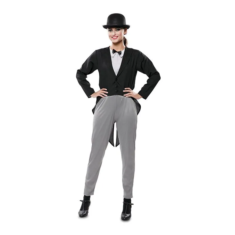 ComposĂ© d’un pantalon gris et d’une veste avec un tshirt blanc et un noeud papillon noir, ce costume sera parfait pour un incarner le comique le temps d’une fĂŞte.