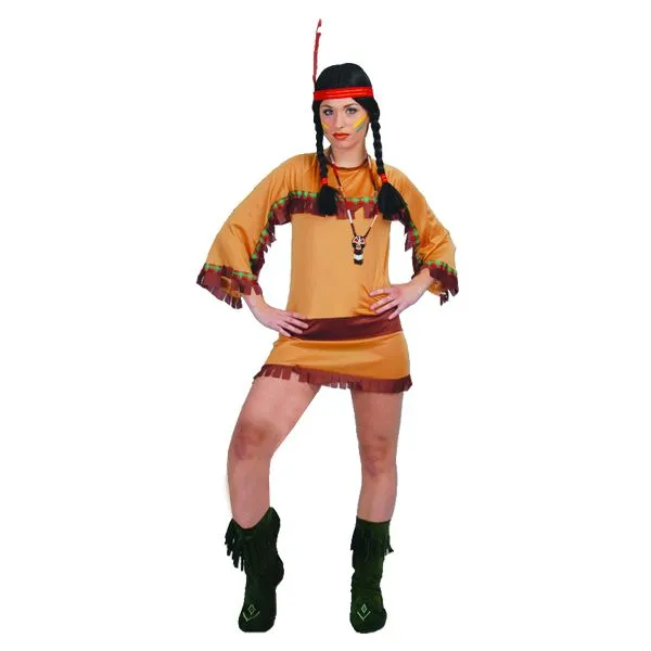 Déguisement d’Indienne composé d’une robe courte beige à franges. Un bandeau tour de tête avec plume à placer sur le front vient parfaire la tenue.