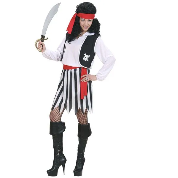 Très complet, ce dĂ©guisement de pirate pour femme est composĂ© d’un t-shirt blanc, d’une veste noire Ă tĂŞte de mort, d’une jupe rayĂ©e noire et blanche avec ceinture rouge et d’un bandeau tour de tĂŞte. Pour complĂ©ter et parfaire votre tenue, n’hĂ©sitez pas Ă piocher dans nos accessoires de pirate !