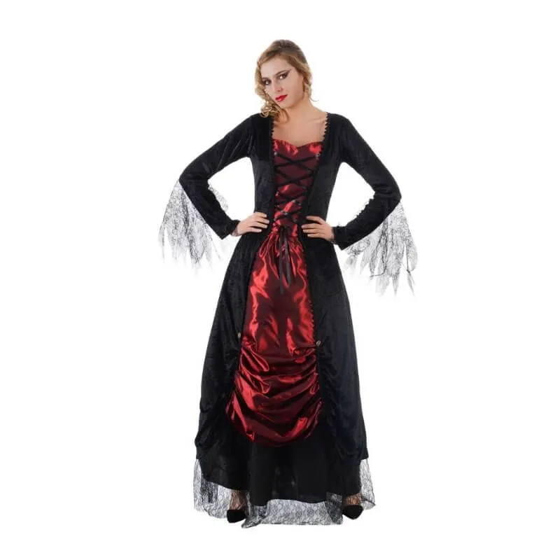 Ce dĂ©guisement est composĂ© d’une robe et d’un ras de cou. La robe est noire et rouge Ă manches longues avec des voiles et un effet de corset ancien au niveau du haut. Cette dernière possède Ă©galement un rappel de voilage au niveau du bas. Le ras de cou est noir et rouge.