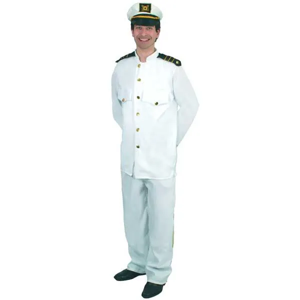 DĂ©guisement de capitaine, taille unique adulte, 100% polyester, composĂ© d’une casquette de marin, d’une veste blanche avec Ă©paulettes, d’un pantalon et d’une paire de gants blanc.
