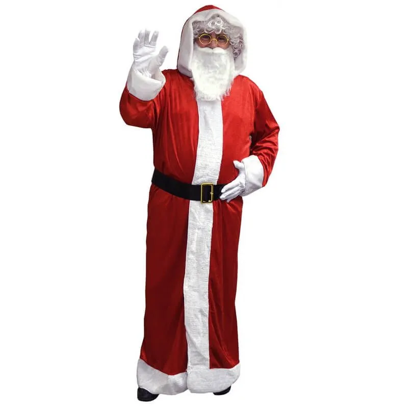 Optez pour ce manteau de Père Noël effet velours pour homme, taille XL cette année pour votre déguisement de Père Noël lors des fêtes de fin d’année.