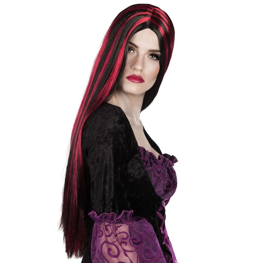 Vous voulez avoir un véritable look de sorcière des ténèbres pour Halloween ? Vous allez être magnifique avec cette perruque aux longs cheveux lisses noirs méchés rouge !