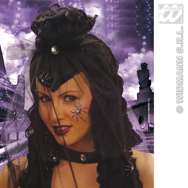 Perruque tout aussi Ă©lĂ©gante qu’inquiĂ©tante, composĂ©e de cheveux bruns et bouclĂ©s remontĂ©s en chignon sur le dessus de la tĂŞte. Une voilette est accrochĂ©e au chignon et de belles araignĂ©es avec strass sont incrustĂ©es sur la voilette.
