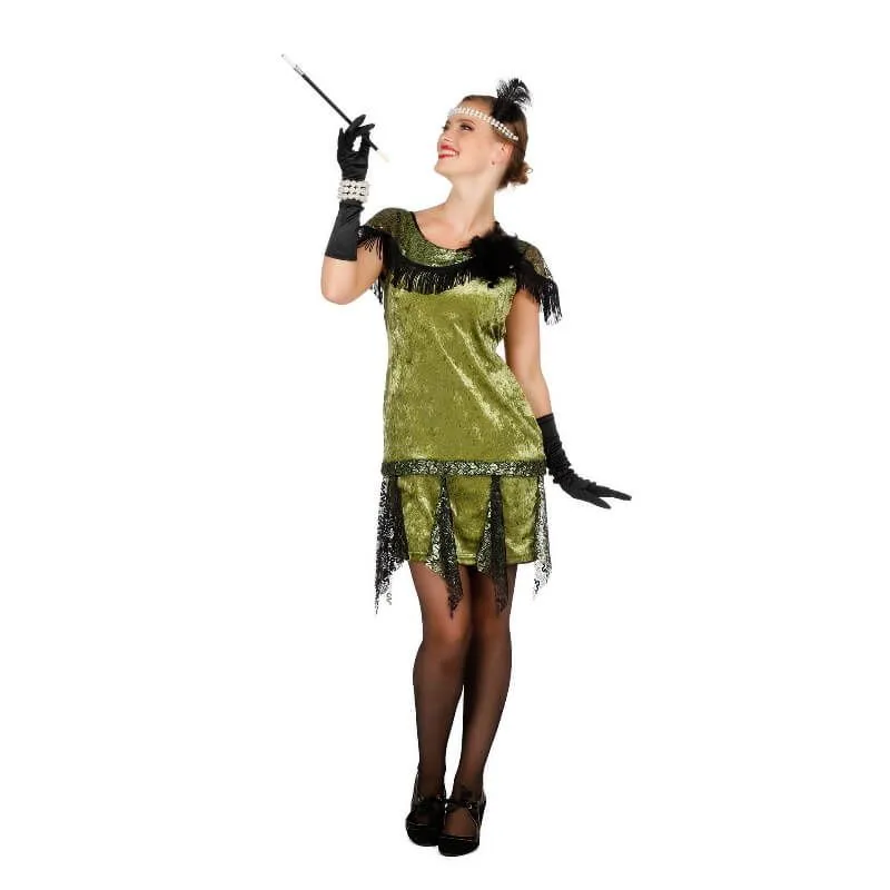 Ce déguisement charleston pour femme comporte une robe de couleur verte en velours.