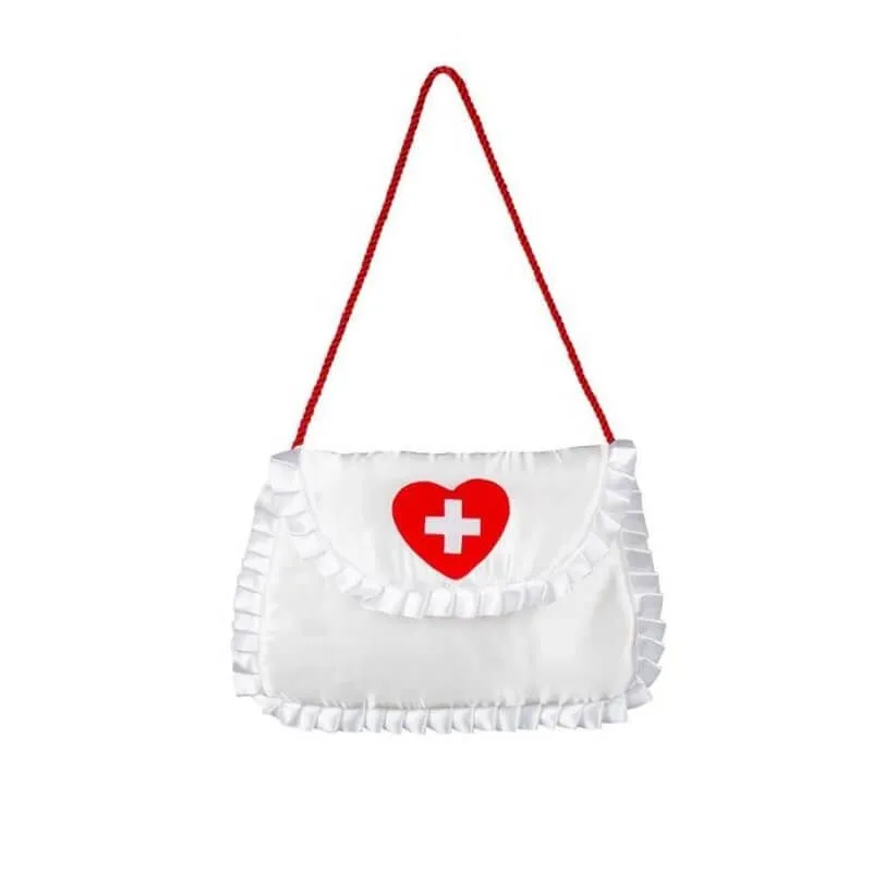 Pour votre tenue sexy d’infirmière ou pour un carnaval, n’oubliez pas votre sac à main ! Et celui-ci est d’une dimension de 20 cm avec une anse en cordon rouge.